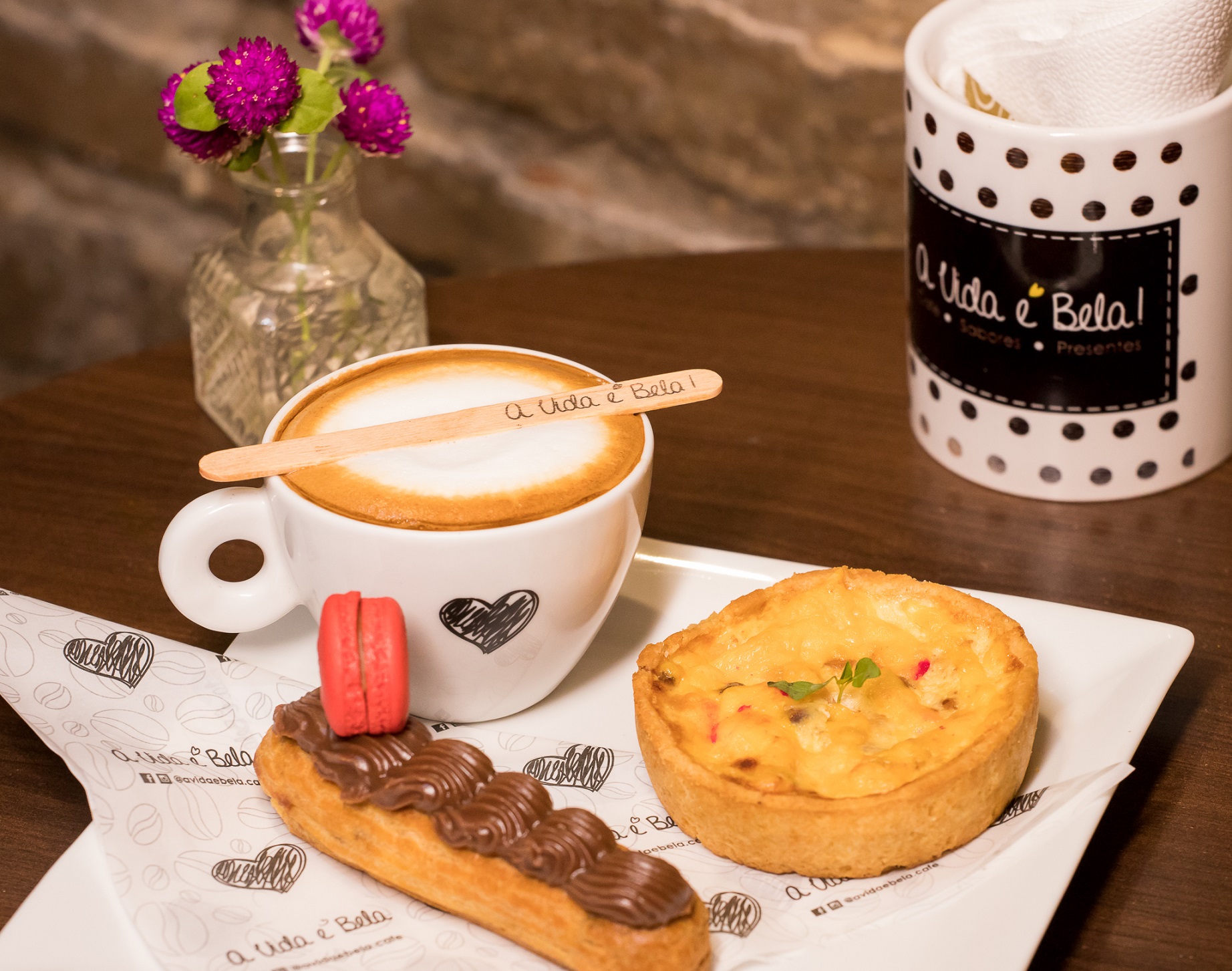 Menu: Latte caramelo (espresso com leite vaporizado saborizado com leve calda de caramelo); Quiche de queijo do reino com toque de geleia de pimenta; e Eclair com recheado e cobertura de chocolate e mini macarron