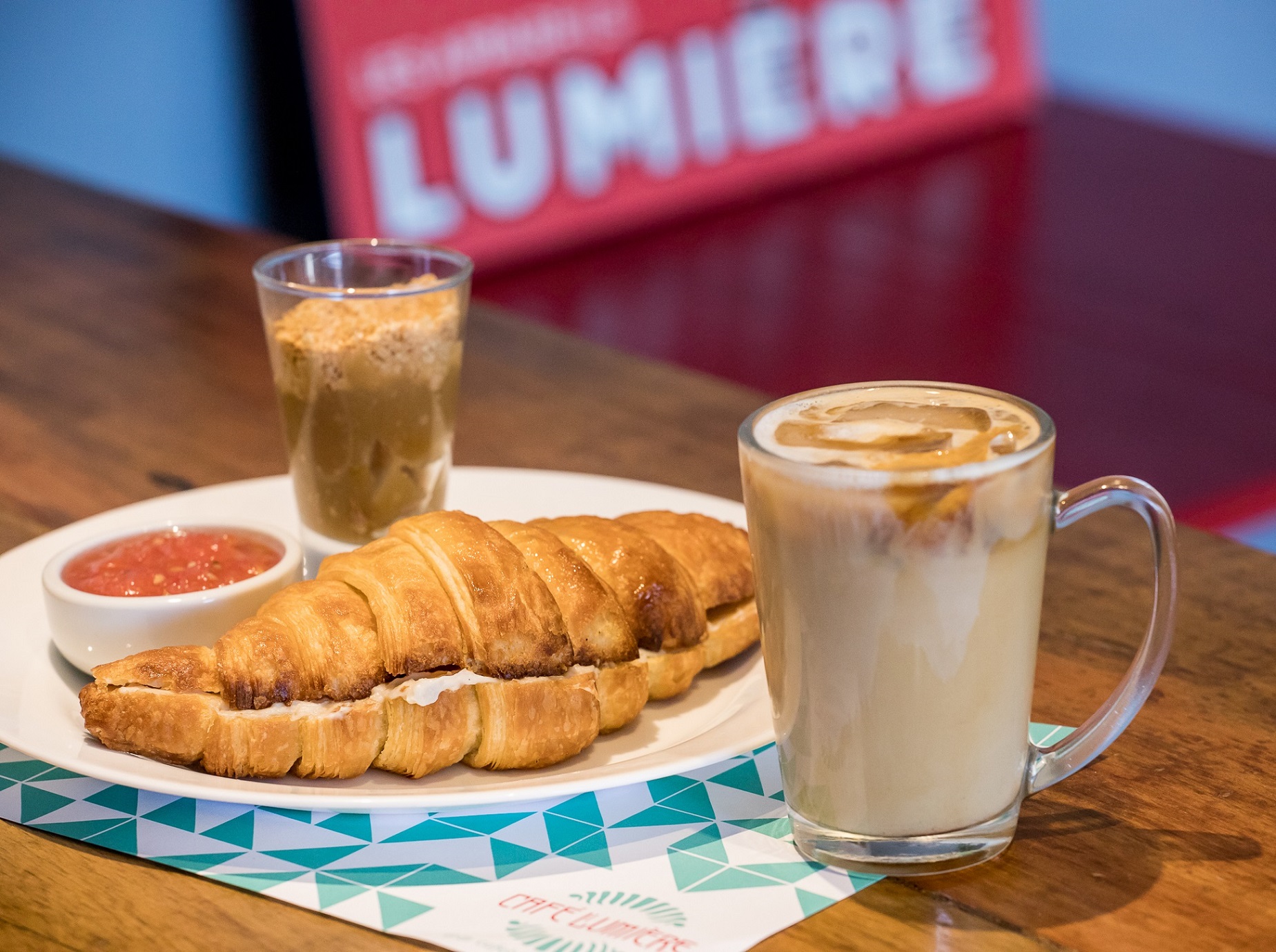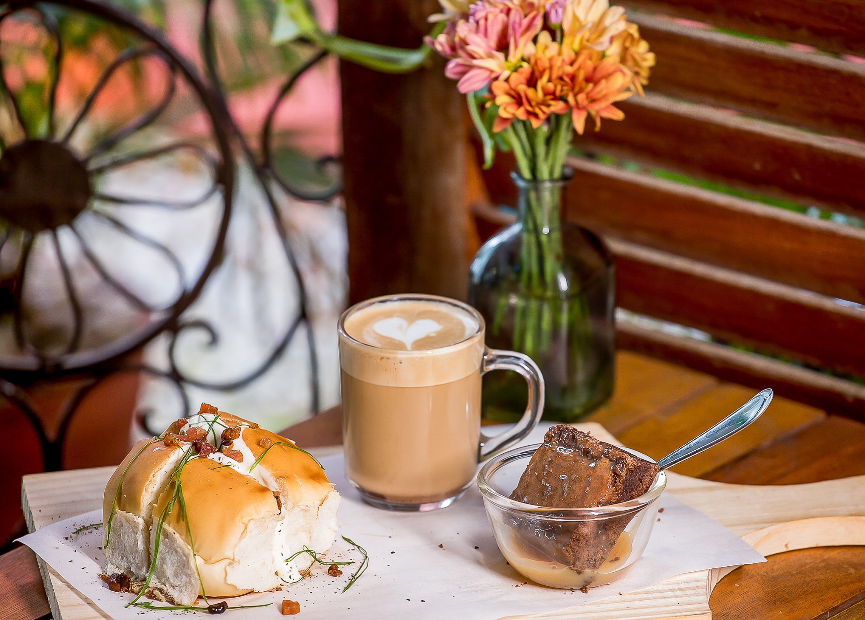 Menu: Clássico latte cremoso; Pão brioche fofinho com recheio de pasta de queijo da casa e cubinhos de bacon; e Brownie da casa coberto com caramelo salgado
