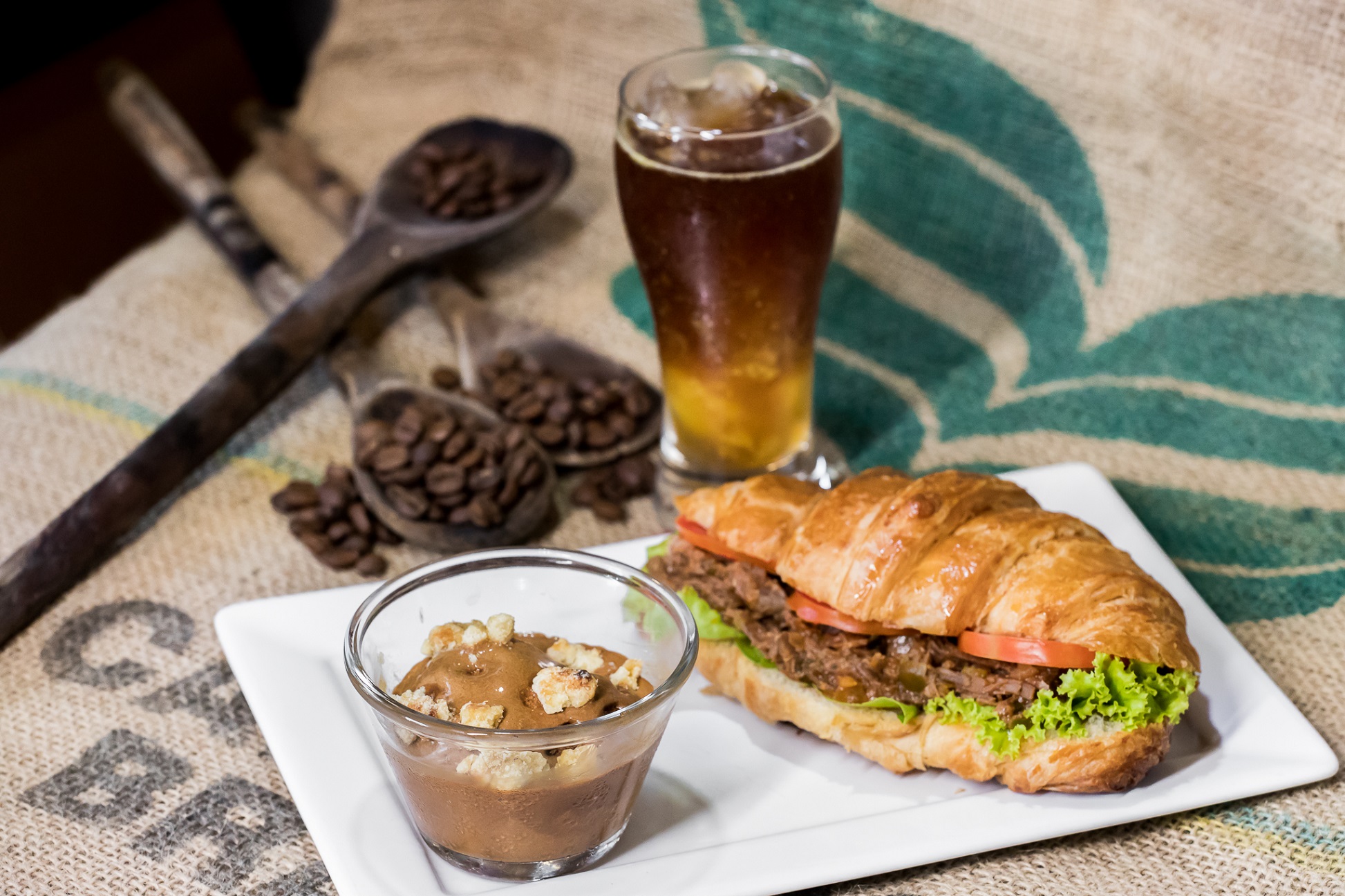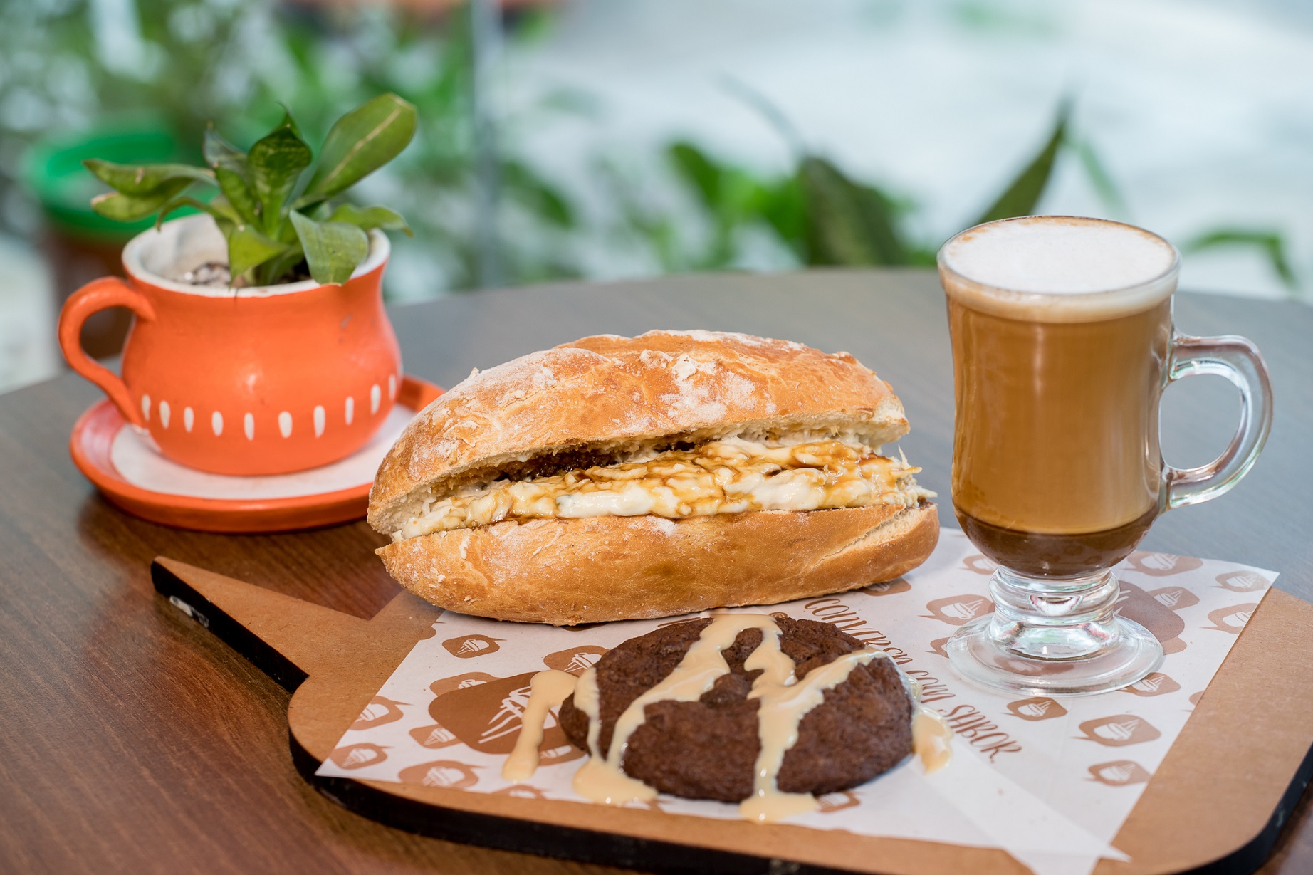 Menu: Macchiato com toque de calda caramelizada de café; Sanduíche de pão italiano, recheado com creme de queijo e frango desfiado, finalizado com mel de engenho; e Cookies de brownie de chocolate meio amargo, coberto com brigadeiro de ninho e café