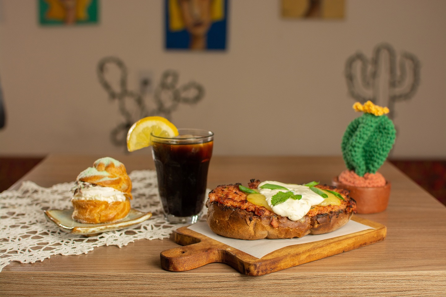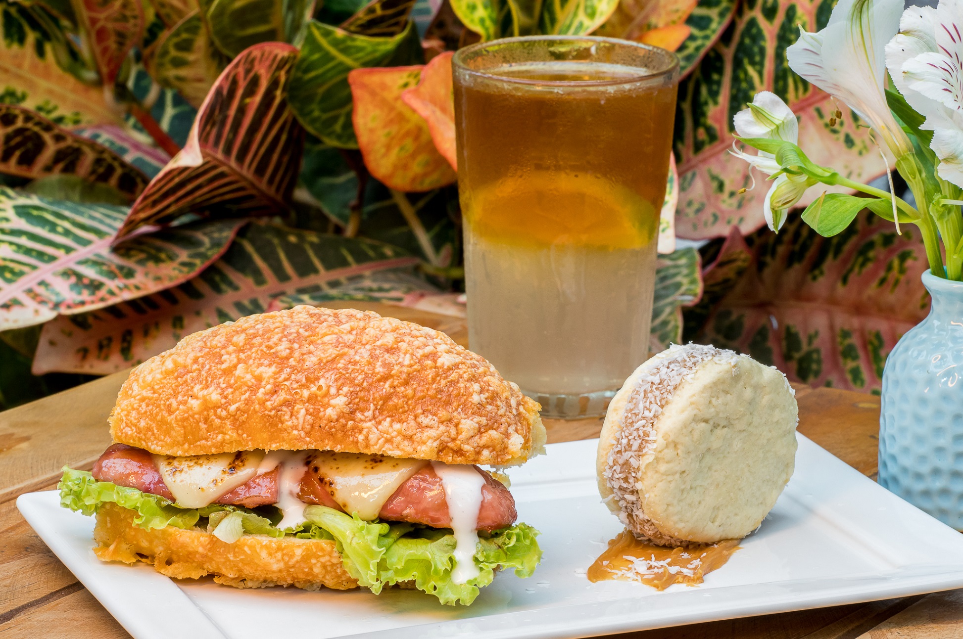 Menu: Refrigerante artesanal de café com limão, à base de kombucha; Pãoliça em pão preto artesanal, recheado com linguiça de pernil suíno temperada com mostarda e mel, coberto com coalhada, hortelã e queijo gratinado; e Choux cream de matcha e chocolate.