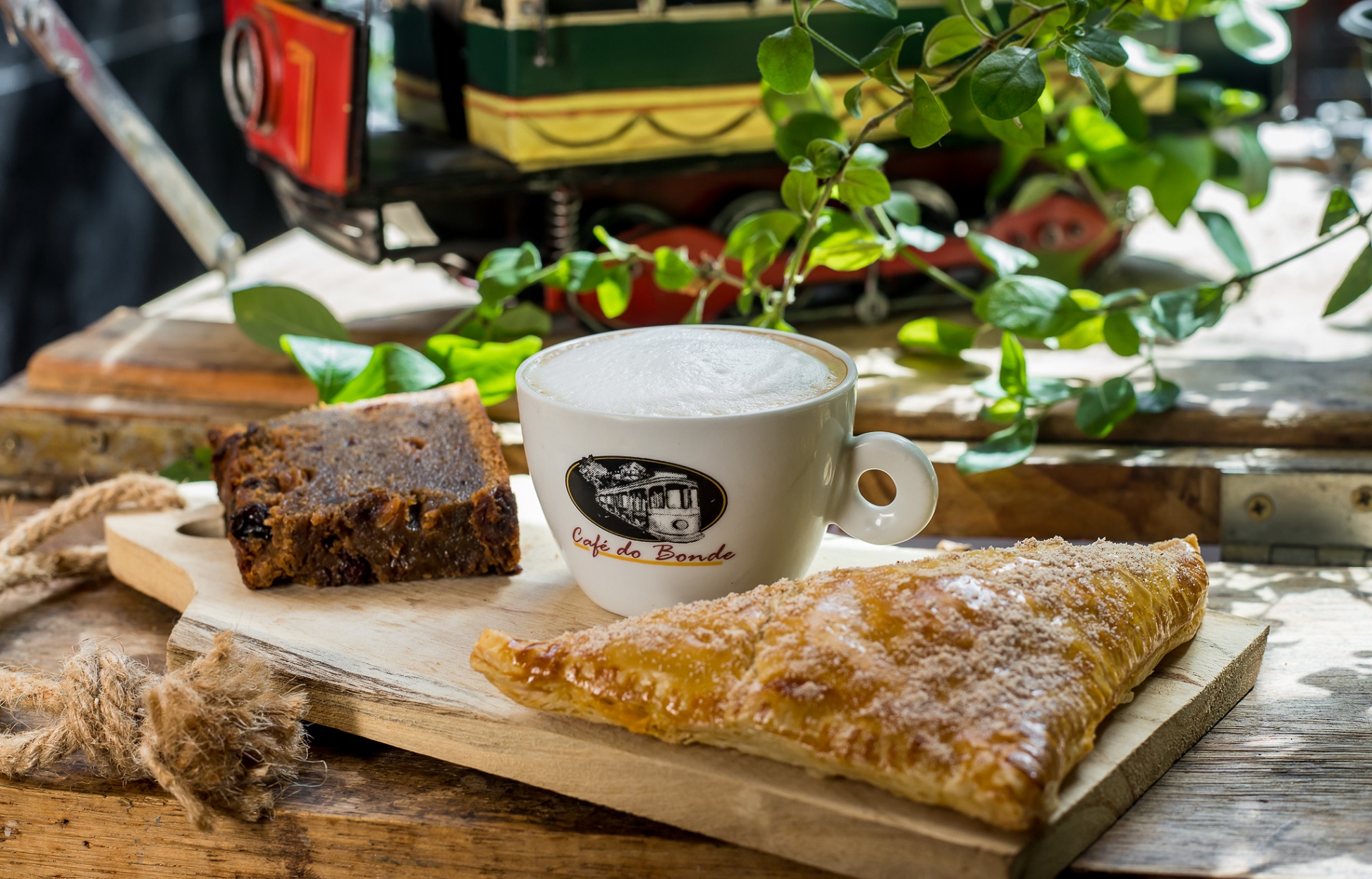 Menu: Espresso com leite vaporizado e aromatizado com baunilha; Pastel de festa feito com massa folhada e carne, polvilhado com açúcar e canela; e Bolo de Noiva