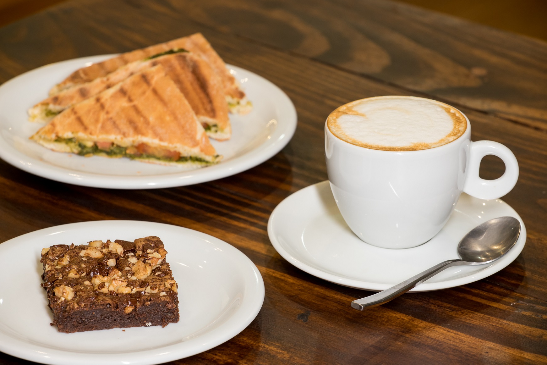 Menu: Cappucino de gengibre; Ciabatta recheado com pesto de manjericão e tomate; e Brownie de chocolate meio amargo com noses