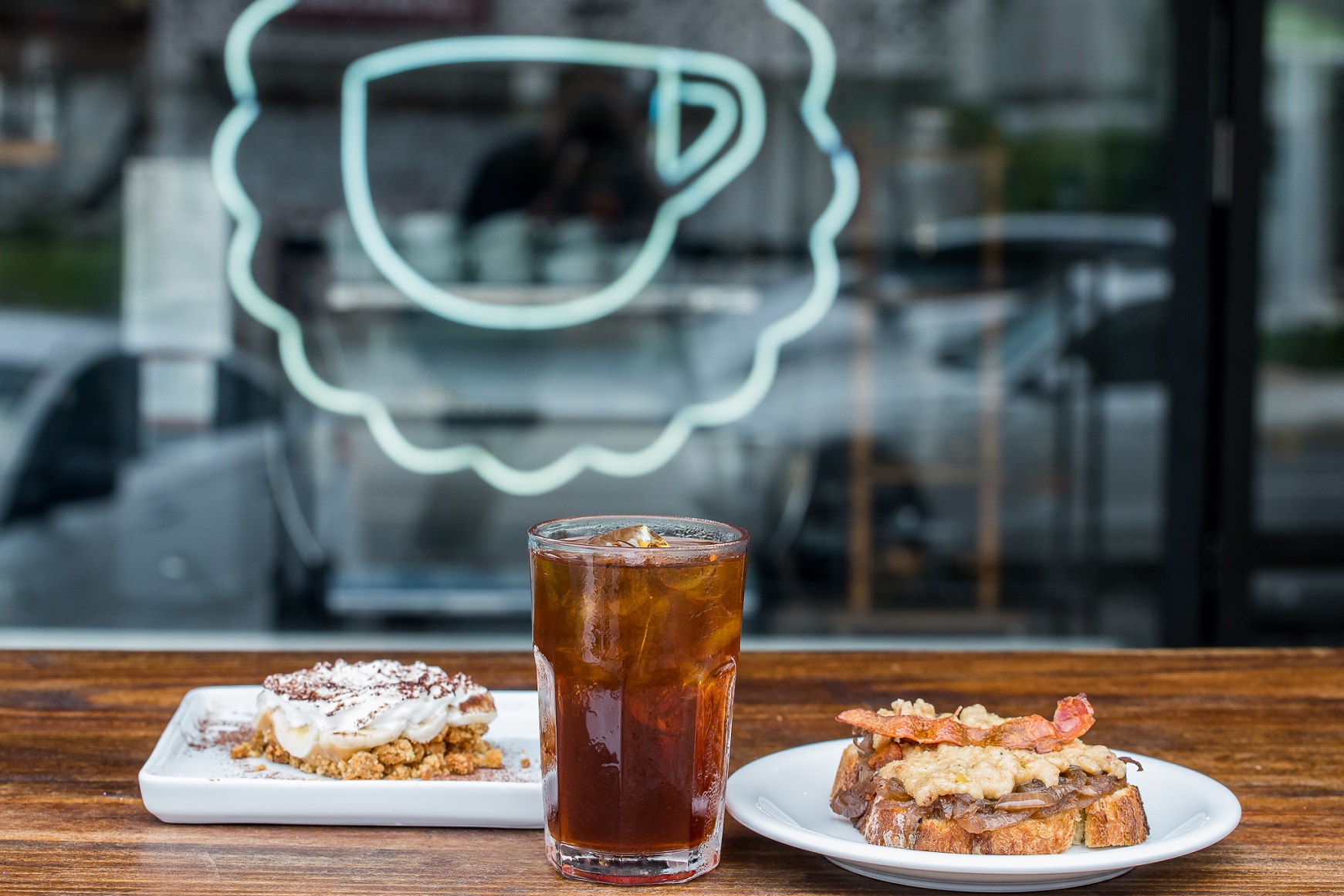 Menu: Cold brew com infusão de cacau; Tartine de fermentação natural com creme de castanha, cebola caramelizada no espresso e chips de bacon; e Banoffee pie