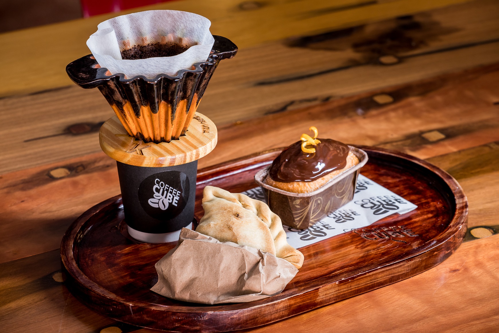 Menu: Café filtrado no Koar; Empanada de pernil suíno com abacaxi; e Bolo de laranja com pedaços de chocolate
