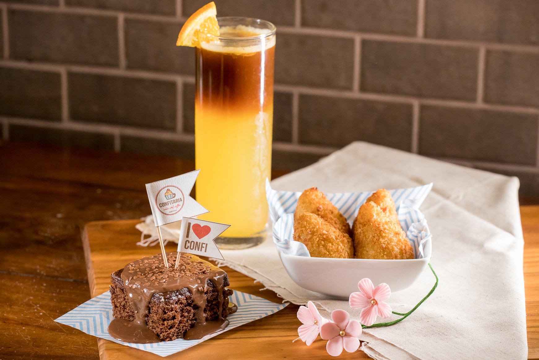 Menu: Sunset Coffee (café gelado à base de espresso, laranja Bahia e água com gás); Coxinha Confitaria (massa de batata, recheio de peito de frango e catupiry – porção com 4 unidades); e Bolo de Chocolate Belga Confitaria – massa de chocolate belga 40% e Brigadeiro Belga quente