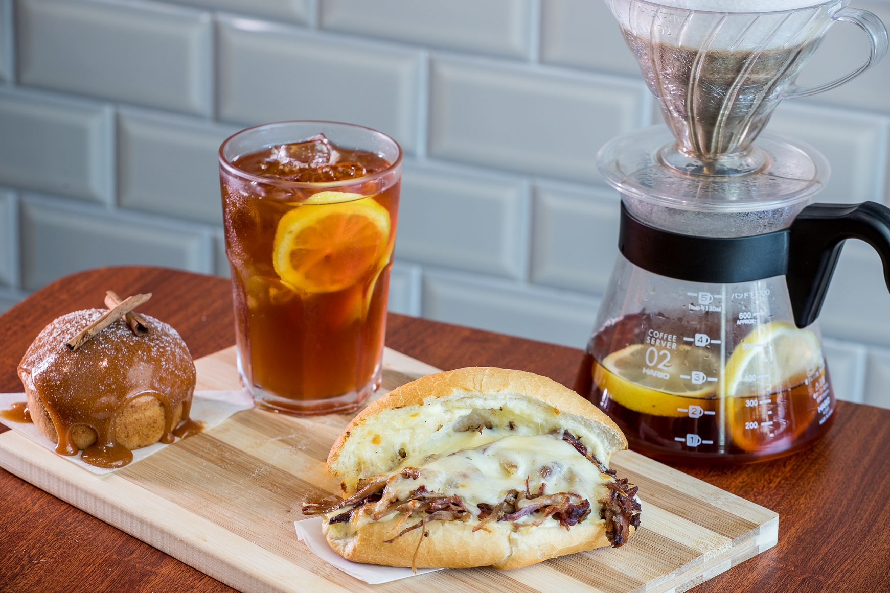 Menu: Iced Coffe Lemon (café extraído na v60 e resfriado no gelo servido com essência natural de limão siciliano); Sanduíche de cupim defumado com queijo muçarela e molho aioli; e Bolo de banana com calda de caramelo