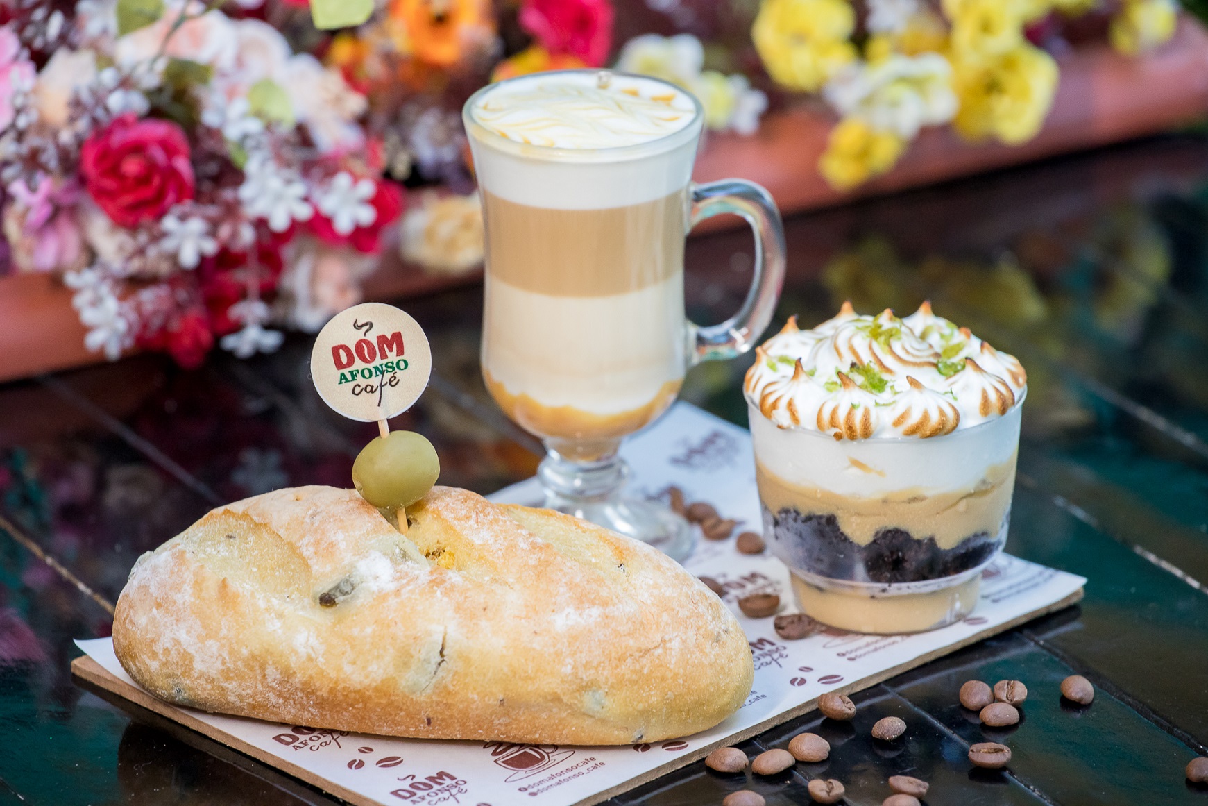 Menu: Mocha doce de leite (fios de doce de leite ao fundo da taça, leite vaporizado e finalizado com café especial); Pão português com farinha de trigo francesa e fermentado naturalmente com levain, com azeitonas argentinas, azeite de oliva e bacalhau; e Verrine (brigadeiro de café, pedaços de brownie e suspiro maçaricado, com raspas de limão)