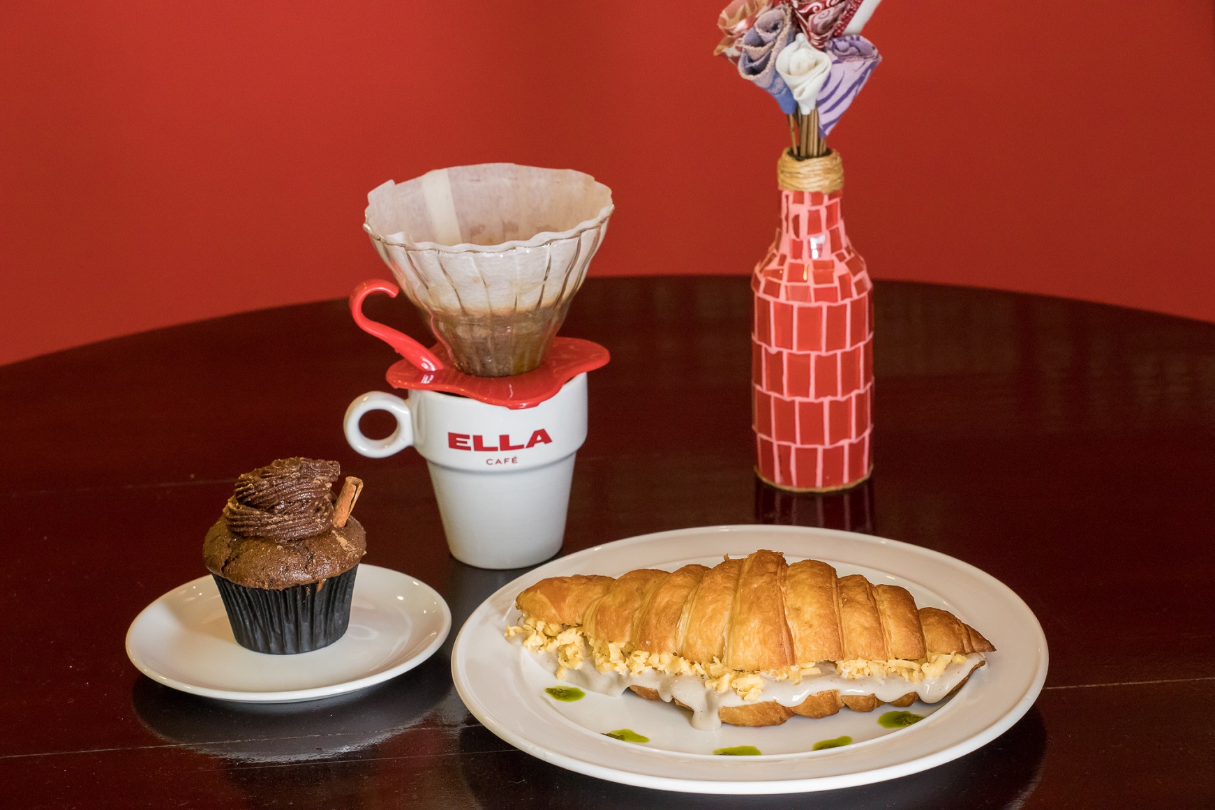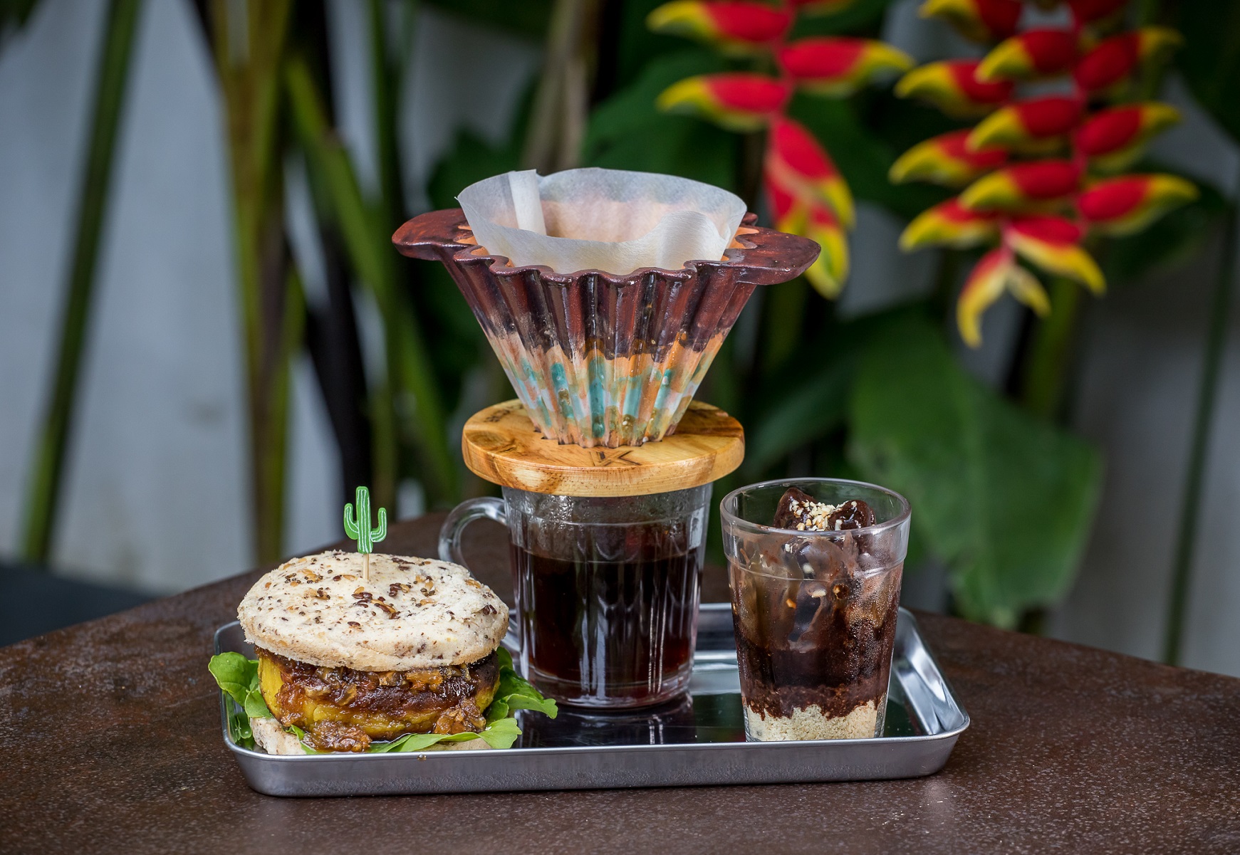 Menu: Café Filtrado no V60; Croissant Vegano com requeijão de castanha defumado e queijo de tremoço; e Cupcake Vegano de Café com leite de aveia e um toque de canela, recheado com ganache de chocolate meio amargo e leite de aveia, polvilhado com canela