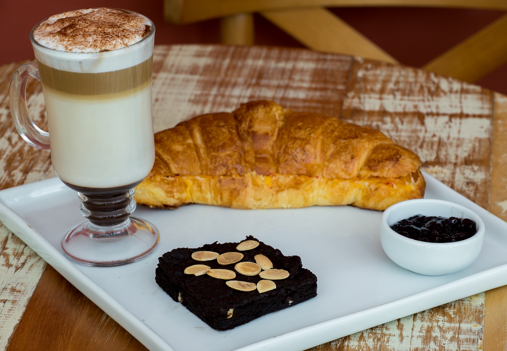 Menu: ChocoMacchiato (uma harmonia com café espresso, leite vaporizado e ganache de chocolate); Croissant parisiense preparado com massa folhada bem aerada e recheado com queijo do reino; e Brownie caseiro de chocolate com café especial polvilhado com lâminas de amêndoas