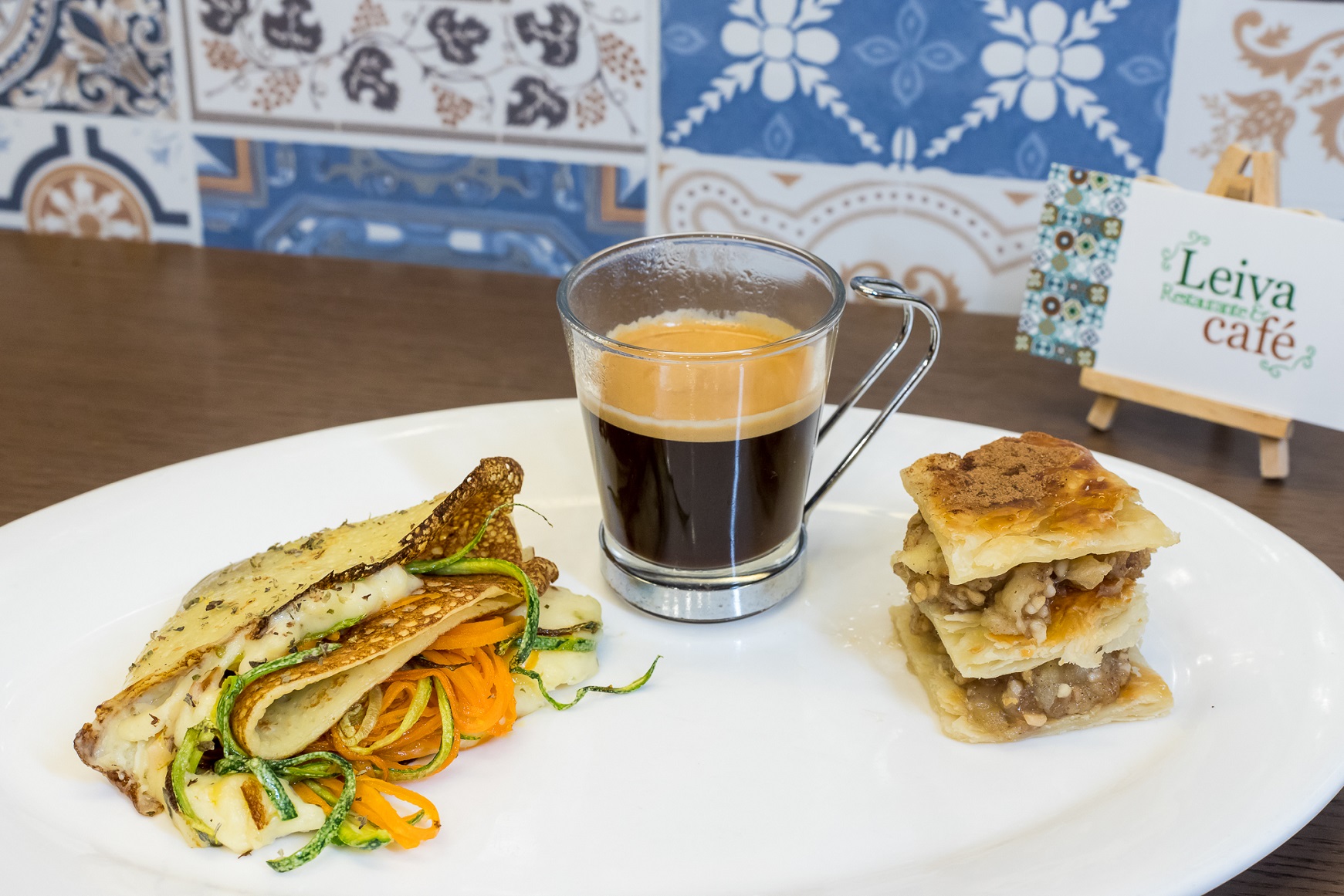 Menu: Espresso 50ml; Crepe recheado com queijo, abobrinha e cenoura; e Folhado de banana caramelizada com nuts