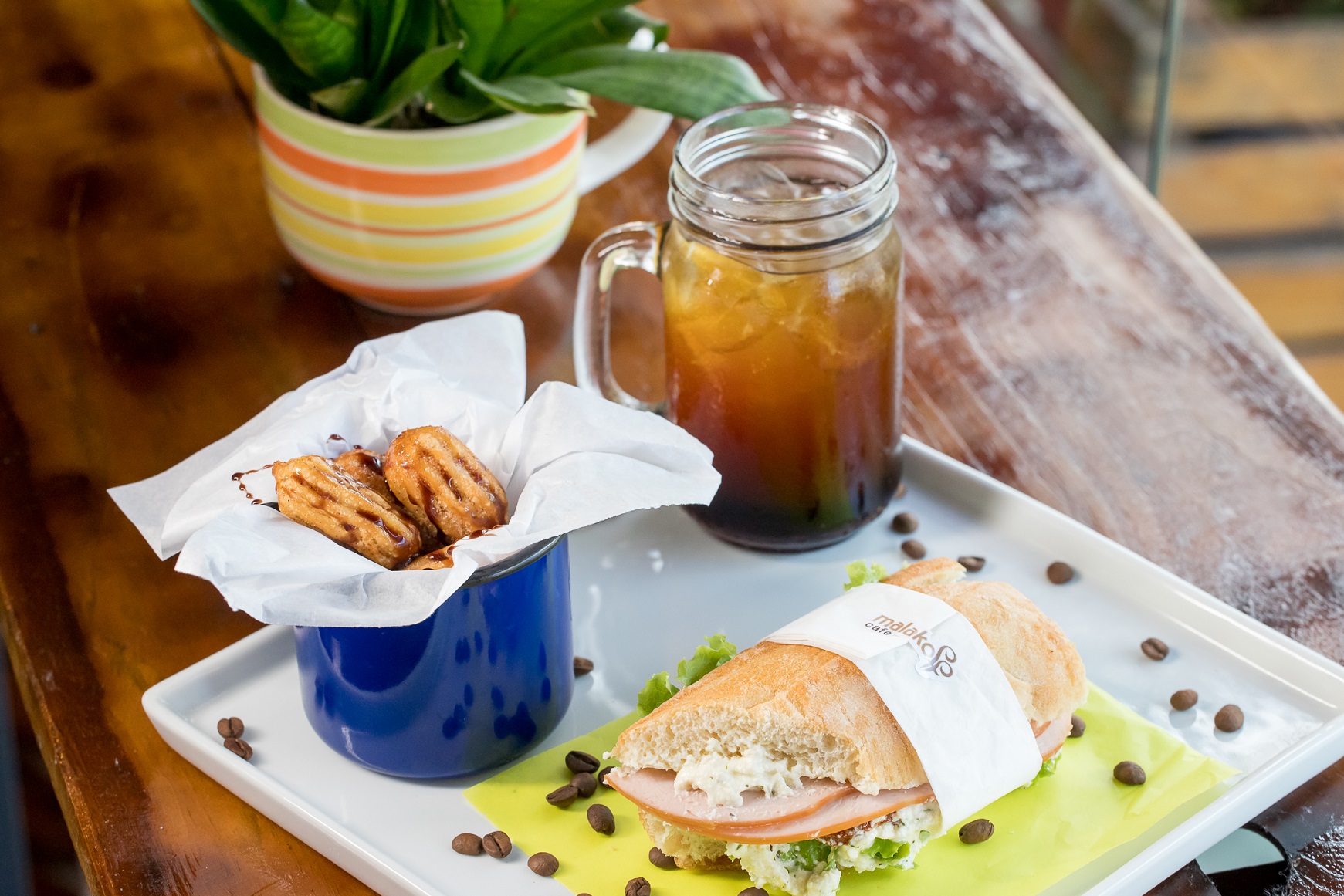 Menu: Cold brew gaseificado com syrup artesanal de hibisco e limão siciliano; Sanduíche de peito de peru no pão Ciabata com pasta de ricota, ervas finas e tomate confitado; e Porção de mini-churros finalizados com calda de café
