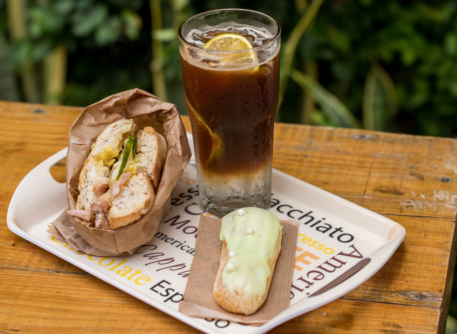 Menu: Espresso tônica (espresso com gelo, água tônica e rodela de laranja); Sanduíche cubano (baguette, pernil suíno, mussarela, presunto, picles de pepino e molho de mostarda); e Éclair de limão – massa choux recheada de creme de limão