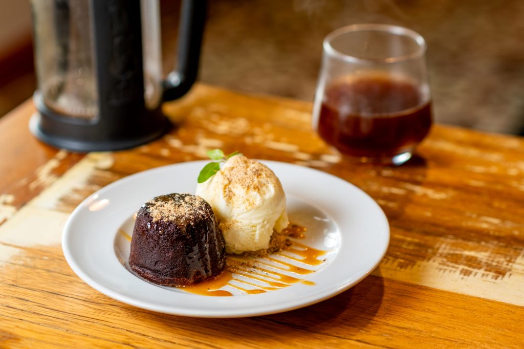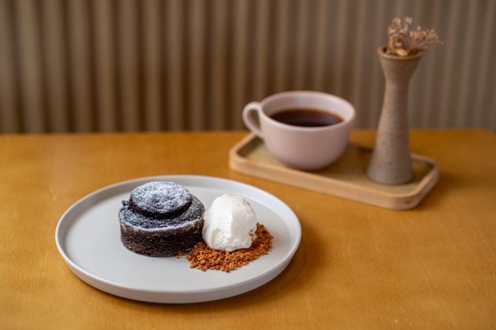 Dupla dos Sonhos: Café filtrado no método Hario V60 com notas de melaço, leve frutas amarelas, acidez cítrica média, corpo médio doçura alta; e Bolo de chocolate com café, recheado com um cremoso brigadeiro de nozes e acompanhado de farofa doce e gelato de baunilha produzido na casa.