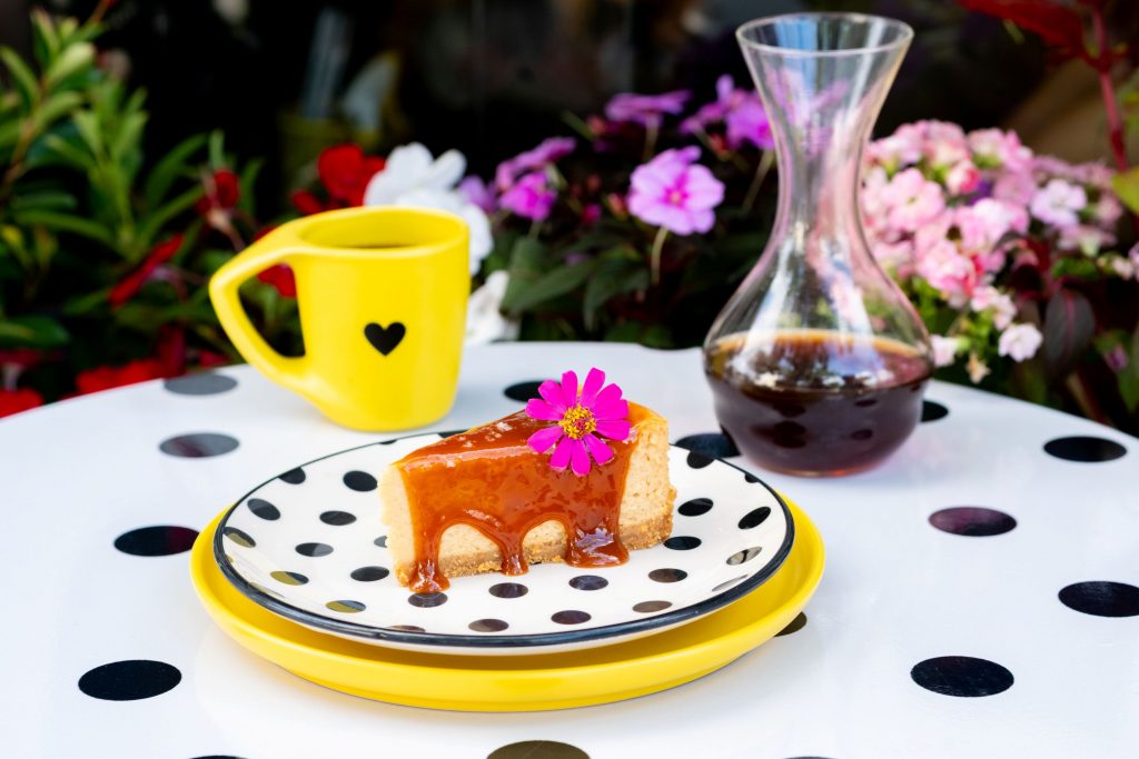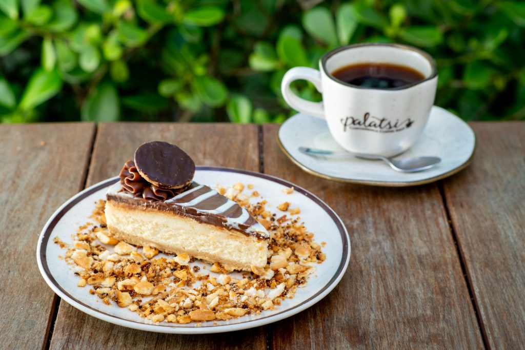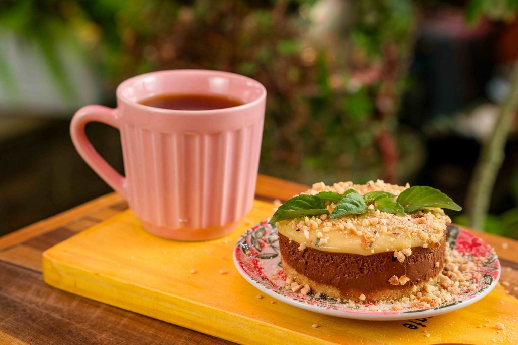 Dupla dos Sonhos: Café filtrado no método koar, com notas sensoriais de chocolate; e Cheesecake caramelo encantado (fina camada de biscoito com receita caseira de cheesecake de caramelo com leve sabor de queijo e cobertura de caramelo salgado).