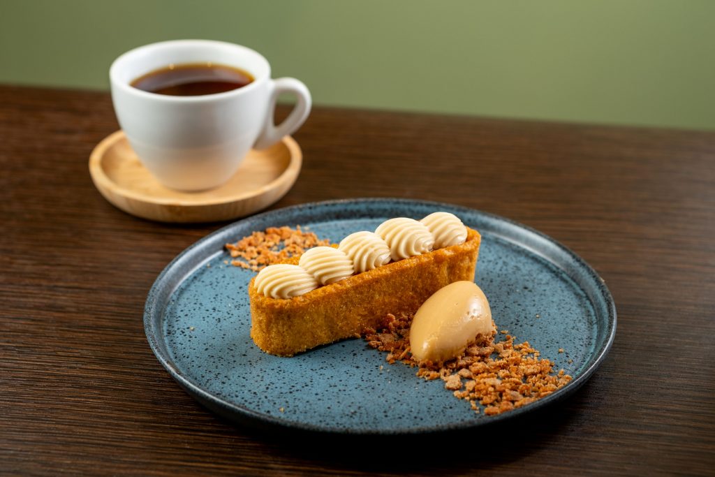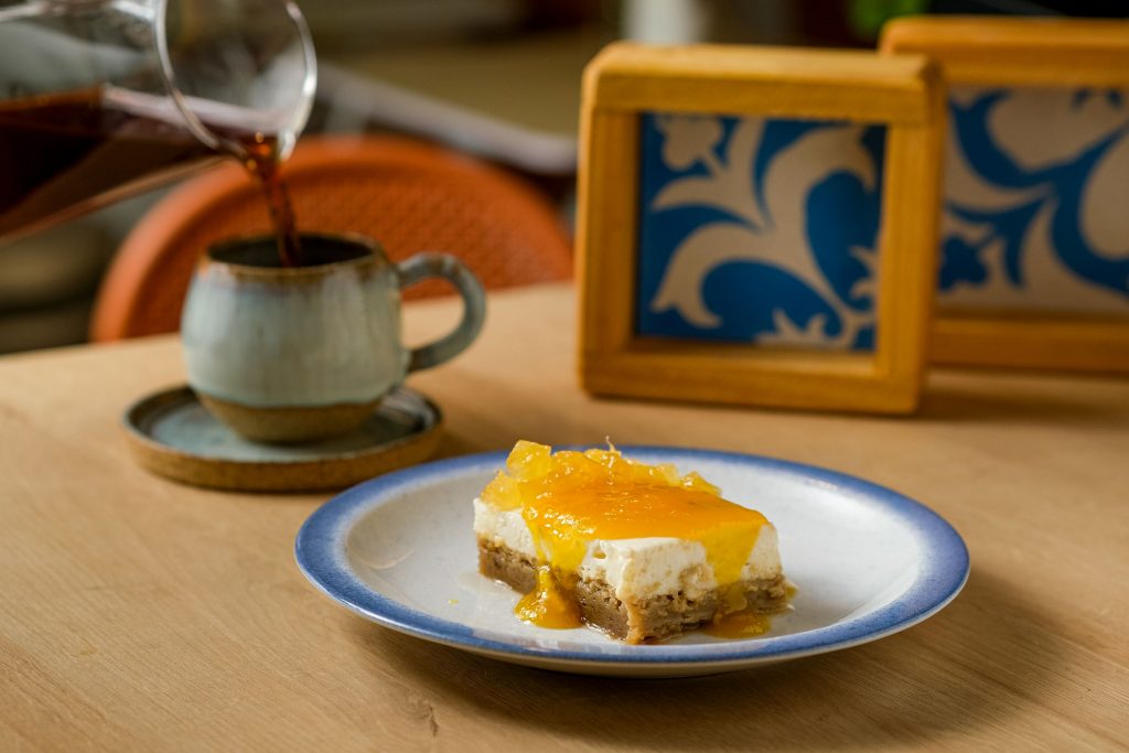 Dupla dos Sonhos: Café filtrado no método Hario V60 com notas sensoriais de frutas amarelas; e Solaris, um encontro de texturas entre blondie e cheesecake, coberto com geleia tropical de manga e maracujá e abacaxi caramelizado.