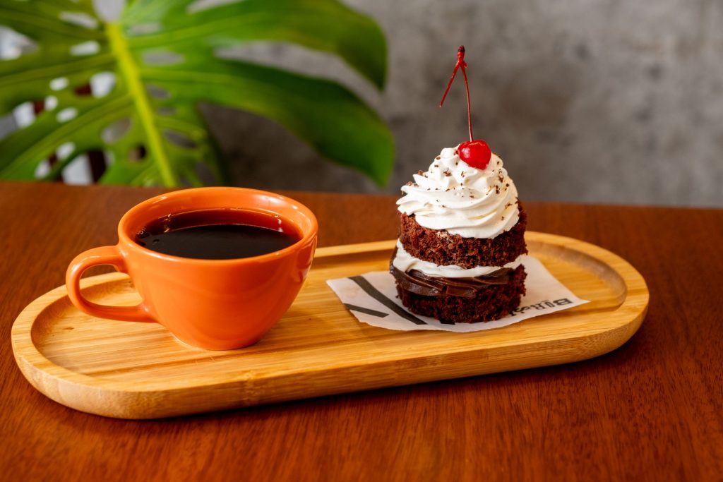 Dupla dos Sonhos: Café filtrado no Hario V60 com notas sensoriais de chocolate, caramelo e mel; e Bolo de chocolate umedecido com café (o mesmo da bebida), recheado de brigadeiro de chocolate e pedacinhos de cereja, finalizado com chantilly, raspas de chocolate e cereja.
