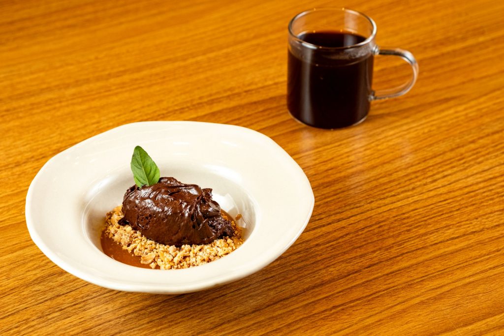 Dupla dos Sonhos: Café filtrado no método Koar com notas de chocolate ao leite; e Tortinha mousse gelada de chocolate meio amargo com base de biscoito e especiarias, finalizada com ganache de maracujá, manjericão e mel, e farofa de castanha de caju.