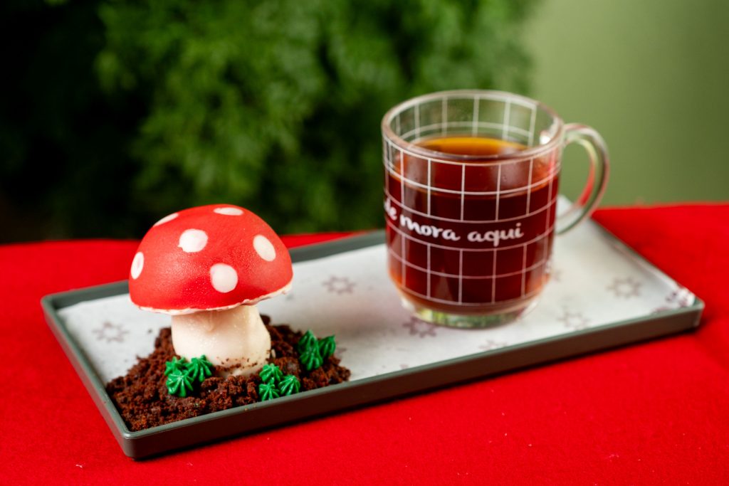 Dupla dos Sonhos: Café filtrado no método Koar, com notas sensoriais de caramelo, chocolate e limão; e Cogumelito, um doce que combina bolo de chocolate fofinho com brigadeiro de chocolate cremoso, recheado com um morango coberto por brigadeiro branco e finalizado com uma casquinha de chocolate e farofa de bolo.