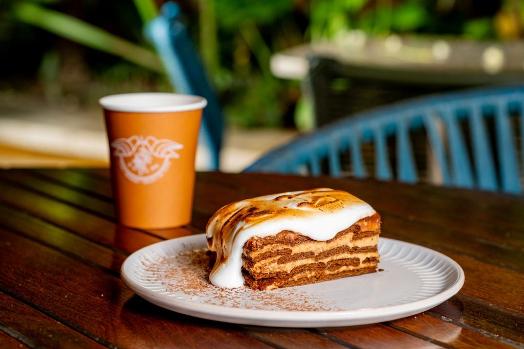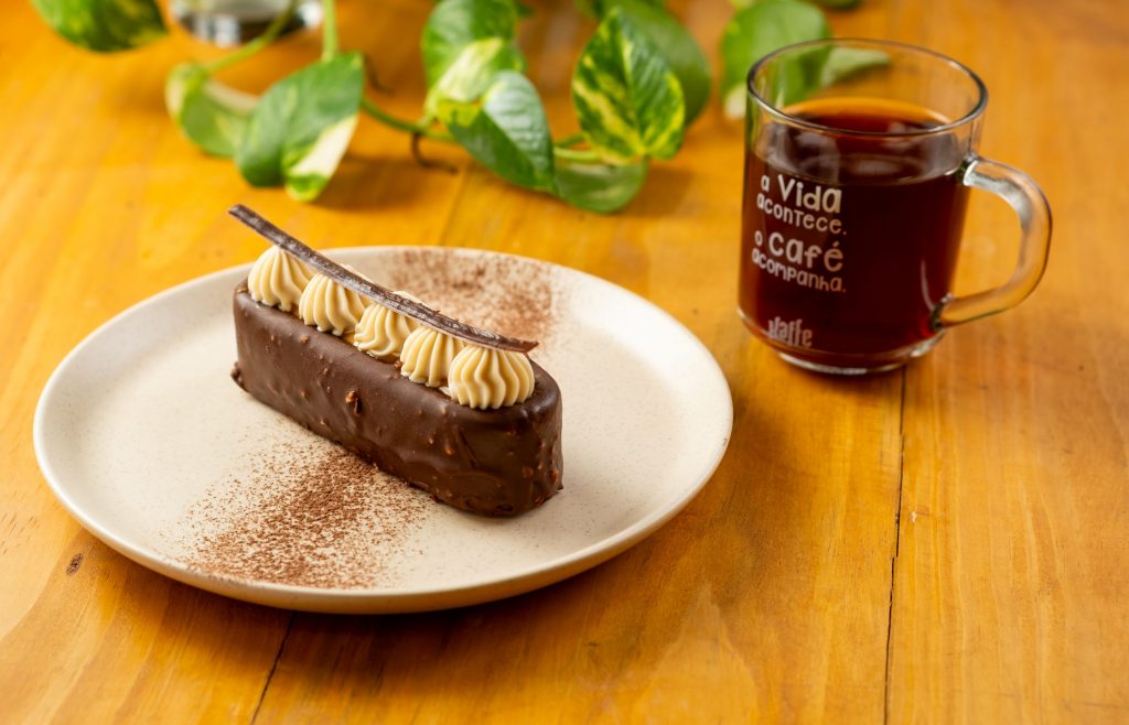 Dupla dos Sonhos: Café filtrado no método Hario V60, com notas de chocolate, caramelo e frutas amarelas; e Torta holandesa, um clássico creme de baunilha com ganache de chocolate, servida sobre um delicioso crumble de biscoito e finalizada com biscoito banhado no chocolate.