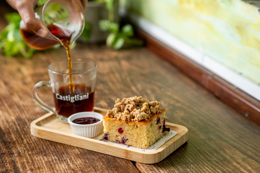 Dupla dos Sonhos: café coado com notas de frutas vermelhas, maple e chocolate branco; e Bolo de Iogurte com frutas vermelhas, com crumble crocante de canela e nossa geleia artesanal de frutas vermelhas.