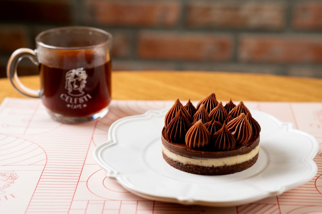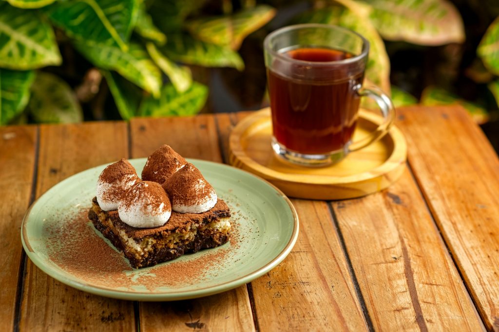 Dupla dos Sonhos: Café filtrado no método Hario V60 com notas sensoriais de chocolate e caramelo; e Chocomisu, elaborado com base de chocolate intenso, recheio de Nutella e tiramisù, coberto com uma nuvem de creme adocicado de cream cheese e finalizado com cacau em pó