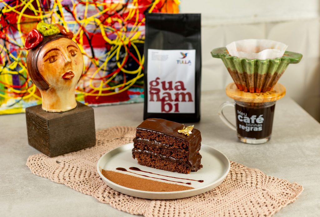 Dupla dos Sonhos: Café filtrado no método Koar, perfil chocolate da Azo Roasters sensorial de chocolate, baunilha, avelã e manteiga; e Torta argentina em camadas, com chocolate, doce de leite e cream cheese, finalizados com ganache meio amarga.