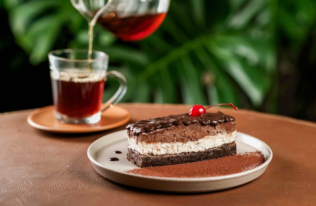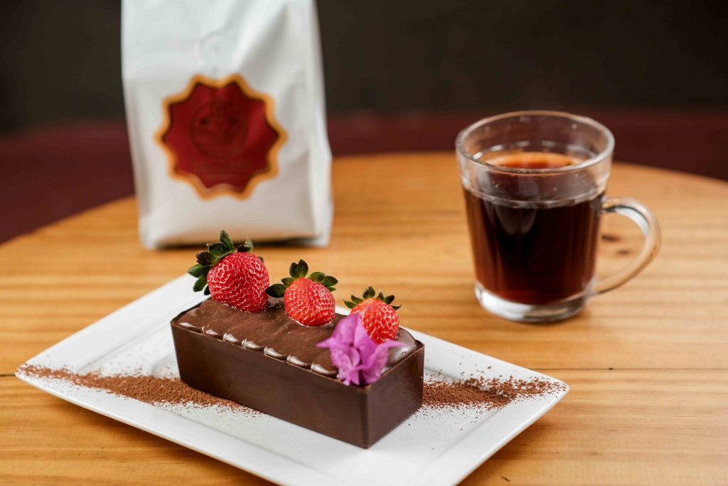 Dupla dos Sonhos: Café Takwary filtrado no método Koar, com notas de caramelo e chocolate; Bolo bombom Chocolatudo, feito com casca de chocolate nobre meio amargo, bolo molhadinho de chocolate e recheio cremoso de chocolate, finalizado com morangos.