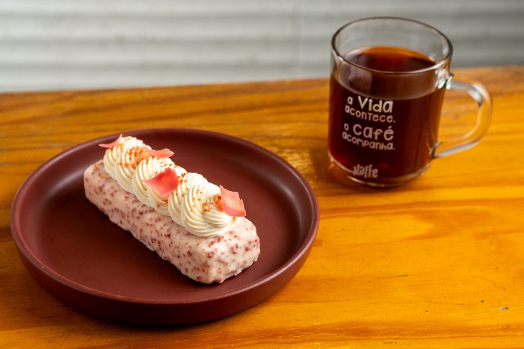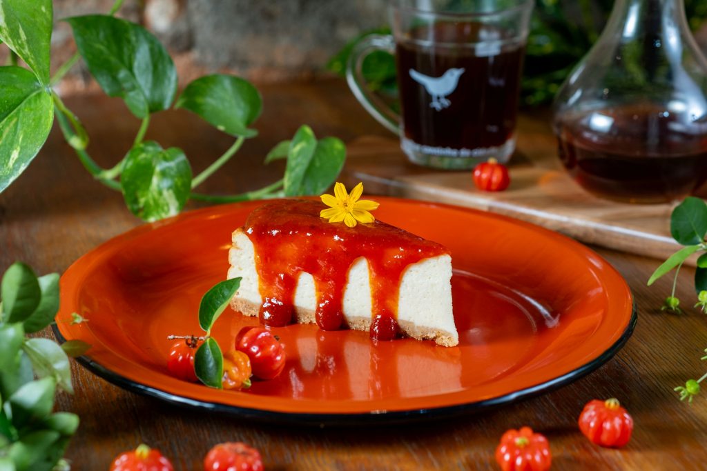 Dupla dos Sonhos: Café filtrado no método Koar, com notas sensoriais frutadas; e Cheesecake pitanga do jardim (fina camada de biscoito, torta mousse de forno com leve sabor de queijo e cobertura com redução de geleia de pitanga).