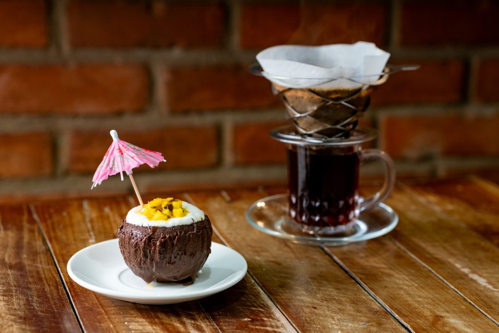 Dupla dos Sonhos: Café Filtrado no Método AltoAir com notas sensoriais de chocolate e amêndoas; Entremet de Coco com manga e maracujá, uma sobremesa gelada de mousse de coco, geleia de manga e maracujá, banhada em chocolate com formato de coco.
