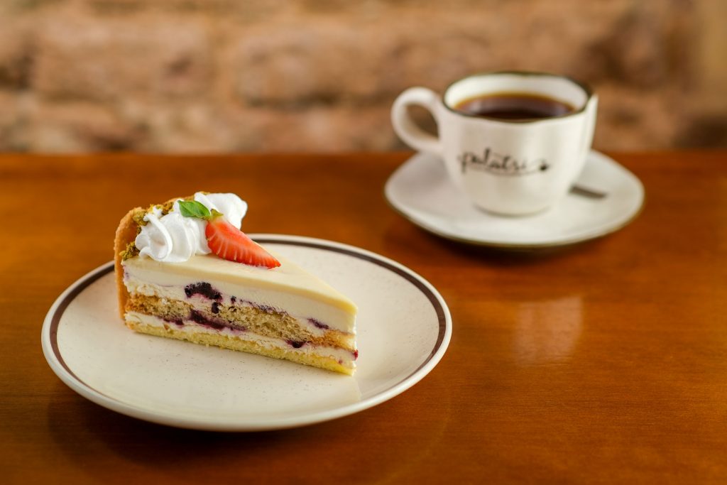 Dupla dos Sonhos: Café filtrado no método Koar, com notas de chocolate, caramelo e frutas amarelas; e Torta Charlotte, com camadas de mousse de cream cheese aveludado, geleia de frutas vermelhas e finalizada com chantilly, pistache e biscoito champanhe.