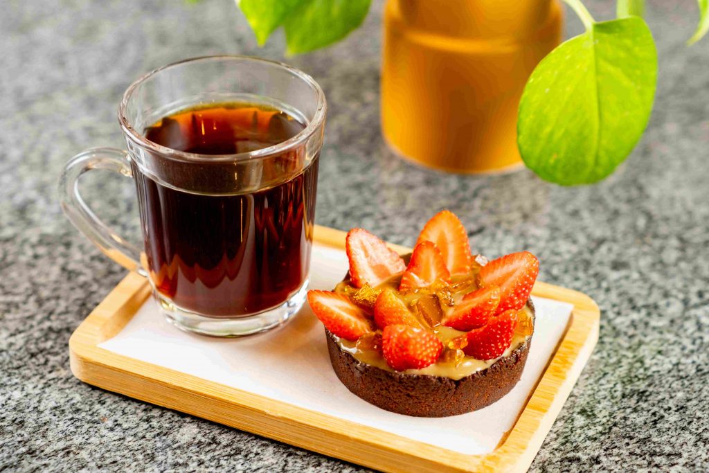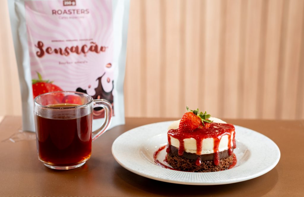 Dupla dos Sonhos: Café filtrado no Hario V60; e Mini Torta de Morango com brigadeiro de café e caramelo, feito com base crocante recheada com o sabor intenso do brigadeiro de café, equilibrado com o frescor do morango e finalizada com um toque adocicado e crocante de caramelo.