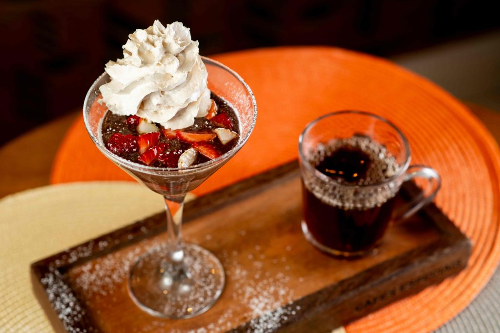 Dupla dos Sonhos: Café filtrado no método Hario V60, com notas saborosas de frutas amarelas, chocolate e caramelo; e Sobremesa que reúne um cremoso fondue de chocolate com café, morangos frescos e chantilly aromatizado com café
